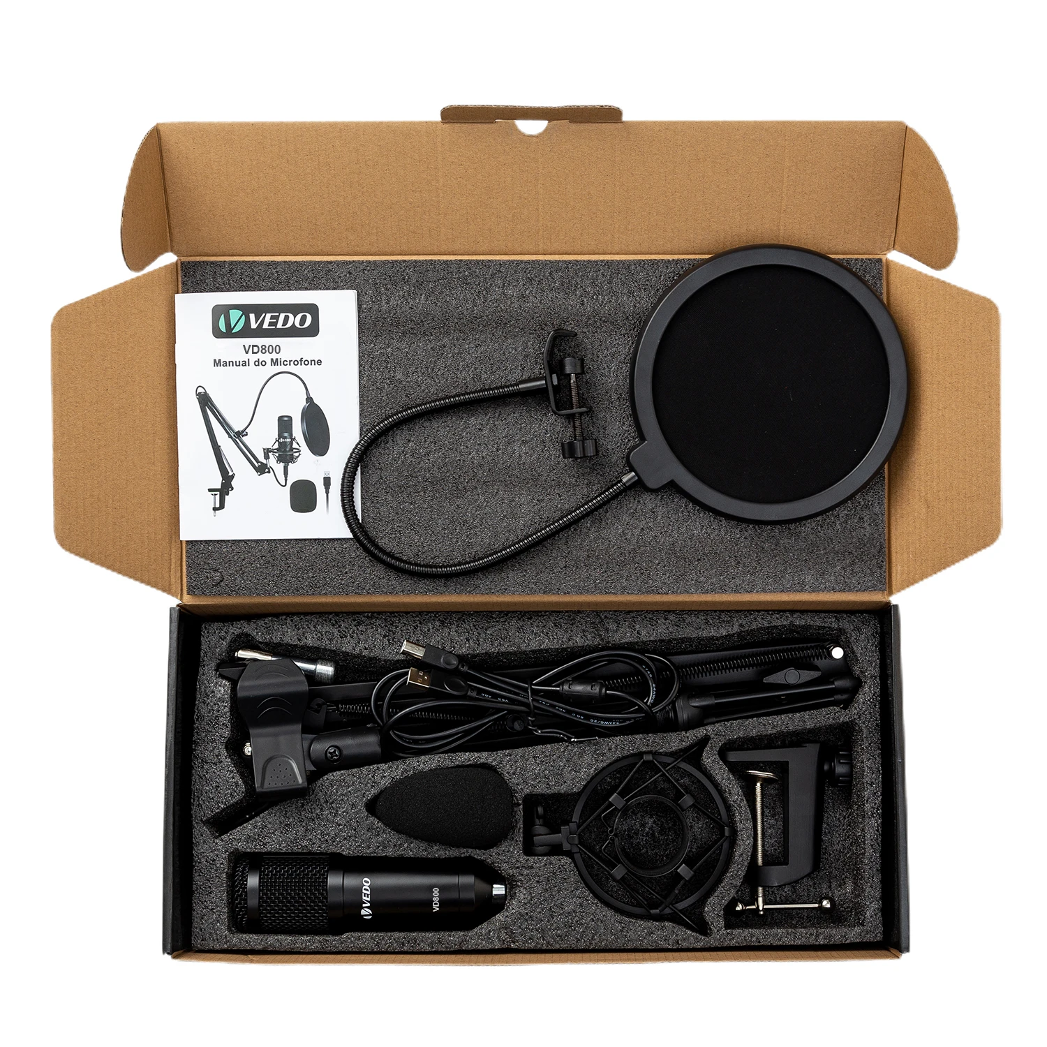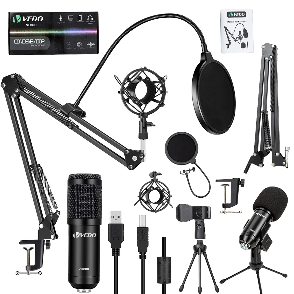 Vedo USB Condensador Record Microfones Kit com Boom Arm RGB Shock Mount, Conjunto de Microfone Cardióide para Game Podcast Stream para Computador